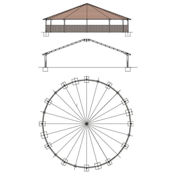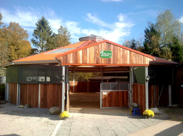 Die Grundkonstruktion einer KRAFT Decken-Führanlage mit Longierzirkel besteht aus einer 12-Eck Stahlkonstruktion. Über die Gestaltung der Zäune wird ein nahezu rundes 24-Eck gebildet. Ohne Führanlage wird daraus eine Longierhalle.