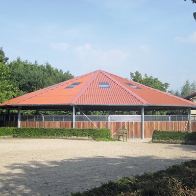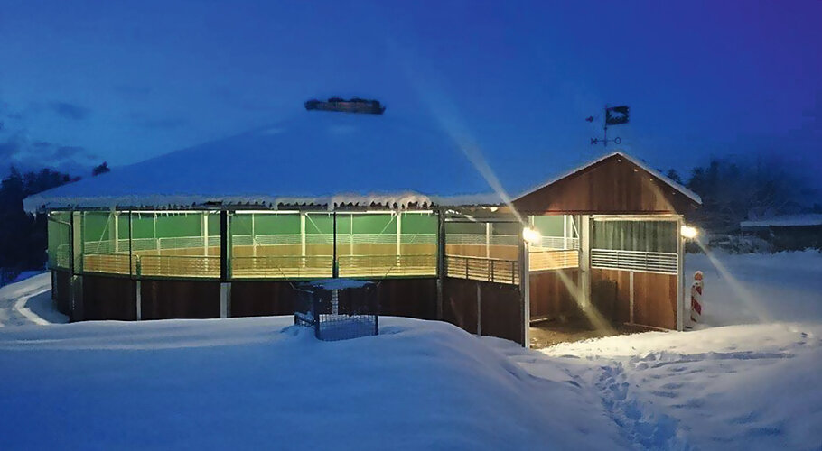 Die Grundkonstruktion einer KRAFT Decken-Führanlage mit Longierzirkel besteht aus einer 12-Eck Stahlkonstruktion. Über die Gestaltung der Zäune wird ein nahezu rundes 24-Eck gebildet. Ohne Führanlage wird daraus eine Longierhalle.