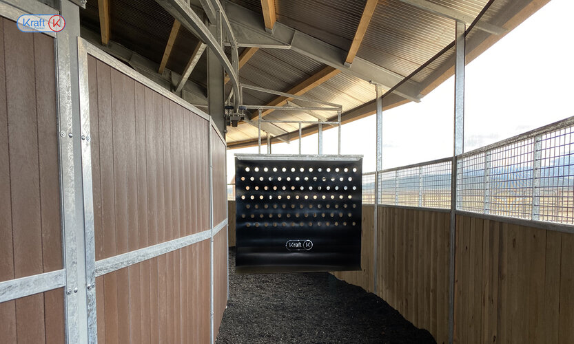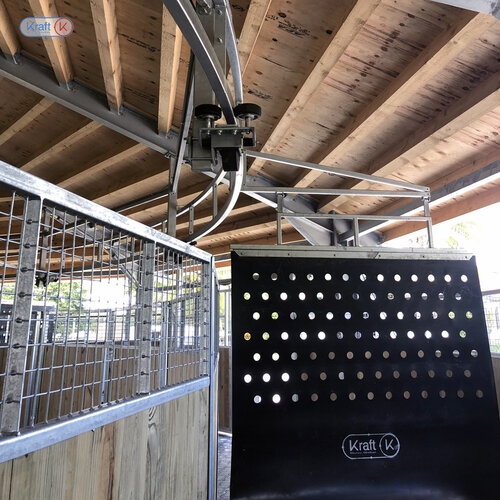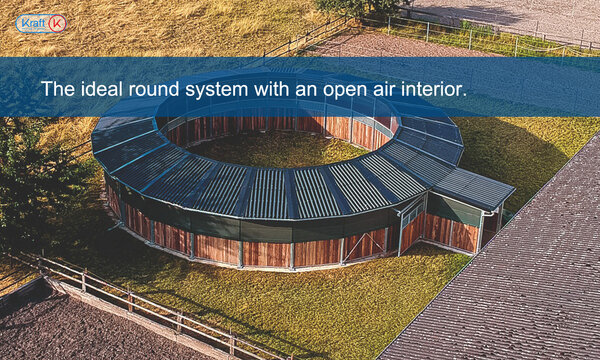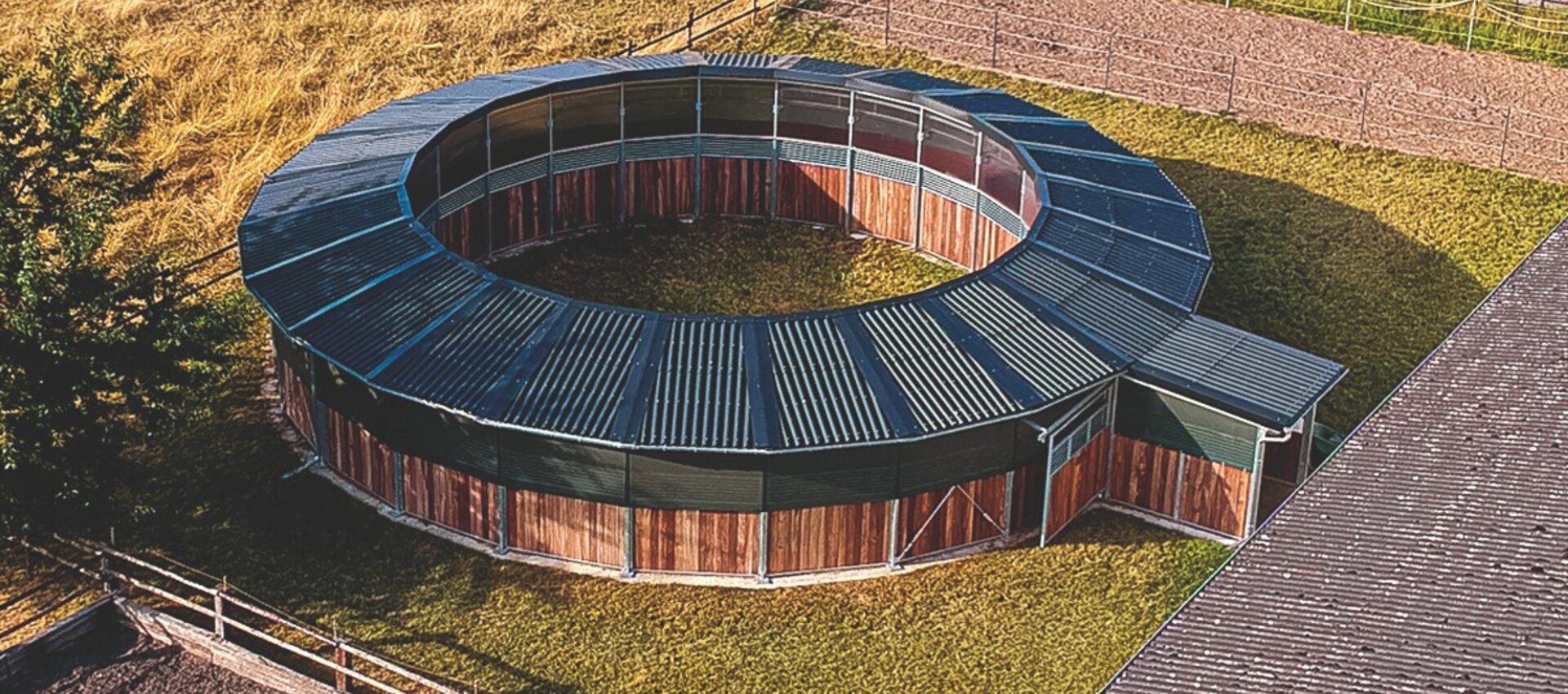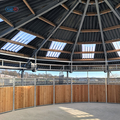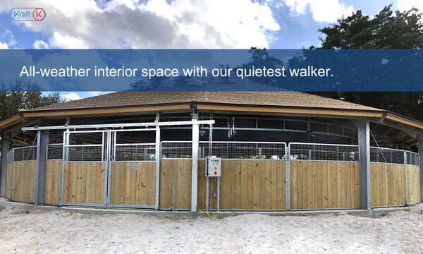 Ideal for farms that need a quiet horse walker that also offers an inner space that can be used for training or storage. This model is a lower cost alternative to the round Rail-Gliding Horse Walker.
